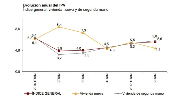 La variación anual del Índice de Precios de Vivienda (IPV) en el segundo trimestre de 2017 aumenta tres décimas y se sitúa en el 5,6%. Por tipo de vivienda, la tasa anual de los precios de vivienda nueva es del 4,4%, más de un punto inferior a la del trimestre anterior. Por su parte, la variación anual de la vivienda de segunda mano sube medio punto, hasta el 5,8%.