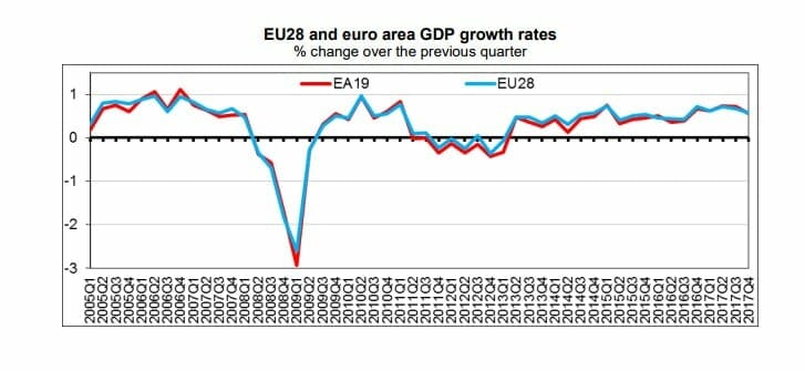 Seasonally adjusted GDP rose by 0.6% in both the euro area (EA19) and in the EU28 during the fourth quarter of 2017, compared with the previous quarter, according to a preliminary flash estimate published by Eurostat, the statistical office of the European Union.