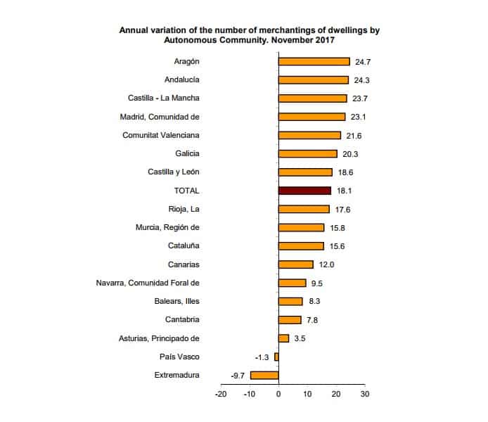 The Autonomous Communities that registered the greatest annual increases in the number of housing sales in November were Aragón (24.7%), Andalusia (24.3%) and Castilla–La Mancha (23.7%). In comparison, Extremadura (–9.7%), País Vasco (–1.3%) and Asturias (3.5%) registered the lowest annual rates in November.