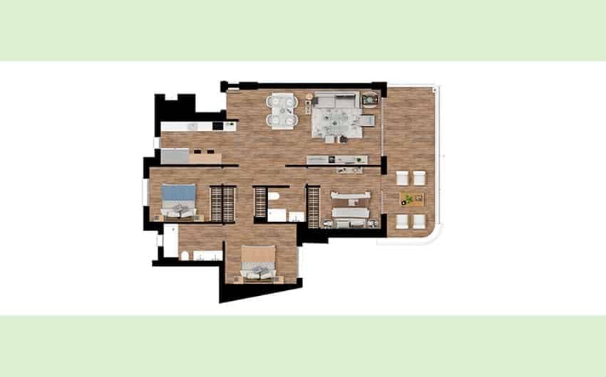 2 bed apartments with prices starting from 398.000€ consisting of 2 beds, 2 baths, total build 104.3 m2, plus Terrace of 41.2 m2